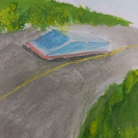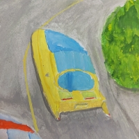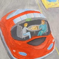 Rəsmdə gələcəyin pilotsuz avtomobilləri təsvir olunub.Yollar genişdir, ətrafda yaşıl meşəlik və gölməçələr var.On planda qırmızı avtomobil öz -özune hereket edir və içində iki sərnişin sakitcə şahmat oynayır.Bu isə gələcəkdə insanların avtomobillərdə təhlükəsiz və rahat şəkildə istədikləri işlərlə məşğul ola biləcəyini göstərir.