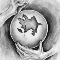 Bu rəsmdə bir cüt əl, parçalanmış Azərbaycanın xəritəsini sanki sap və iynə ilə tikir. Əlindəki iynə ilə parçalanmış torpaqları birləşdirən insan fiquru, yaralanmış Vətənin sağalması, bütövlüyün bərpası və ümid rəmzi kimi təqdim olunur. Rəsm, həm fiziki, həm də mənəvi yaraların sarılmasını simvollaşdırır. Qara və ağ rənglərin kontrastı isə ağrı ilə ümid, keçmişlə gələcək, itki ilə dirçəliş arasındakı incə sərhədi ifadə edir. Əllər insanın öz torpağına olan sevgisini, onu qorumaq və sağaltmaq istəyini göstərir. Bu əsər həm milli birliyin, həm də insanlıqda şəfa tapmağın poetik bir təcəssümüdür “yaralar sağalacaq, Vətən bütöv olacaq” mesajını daşıyır.