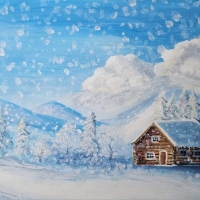 Bu rəsmdə sakit və sehrli bir qış mənzərəsi təsvir olunub. Açıq mavi səma ağ buludlarla örtülüb, havadan yumşaq qar dənələri yağır. Uzaqda qarlı dağlar görünür, onların ətəklərində isə qarla örtülmüş şam ağacları uzanır. Ön planda ağ qarla əhatə olunmuş taxta bir ev yerləşir. Evin pəncərələri və damı qarla örtülüb, bu da mənzərəyə isti və rahat bir ab-hava qatır. Ümumilikdə, rəsim sakitlik, təbiətin saflığı və qışın gözəlliyini əks etdirir.